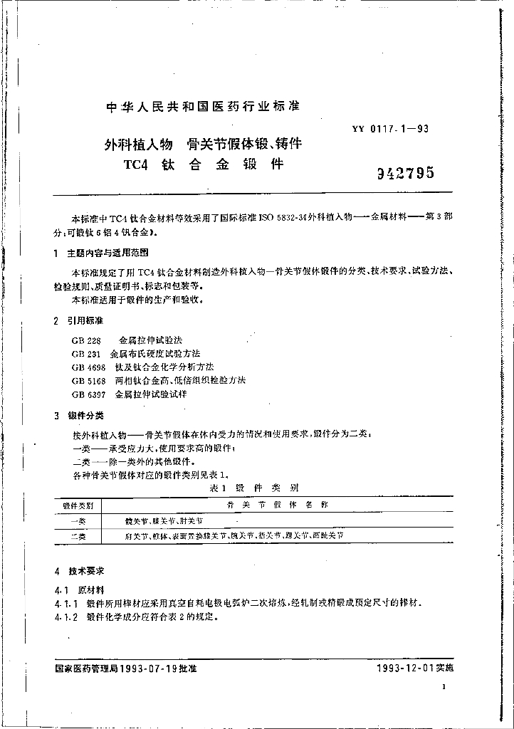 YY 0117.1-1993 外科植入物 骨关节假体锻、铸件 TC4 钛合金锻件