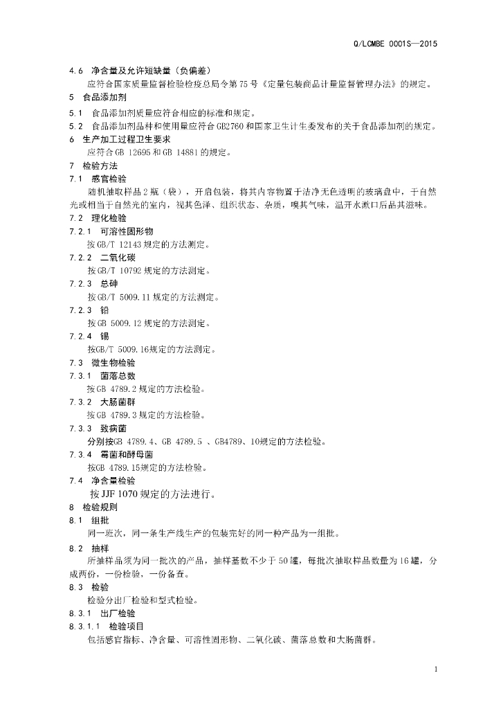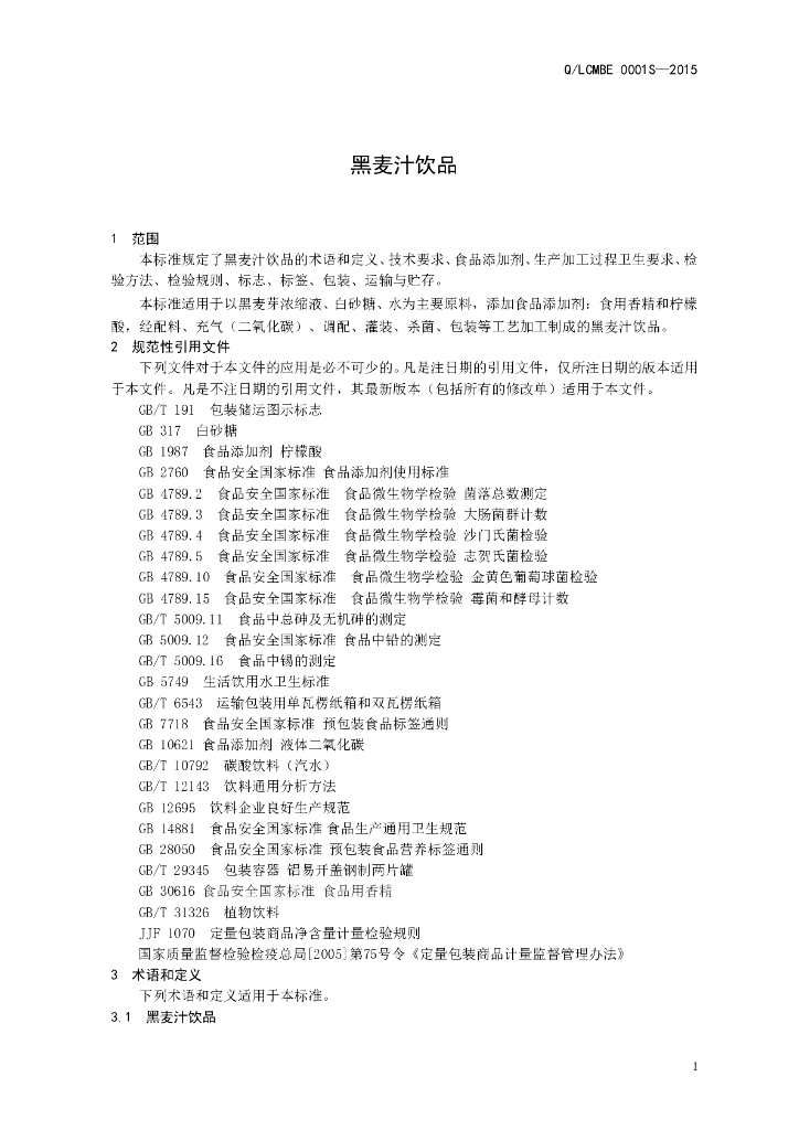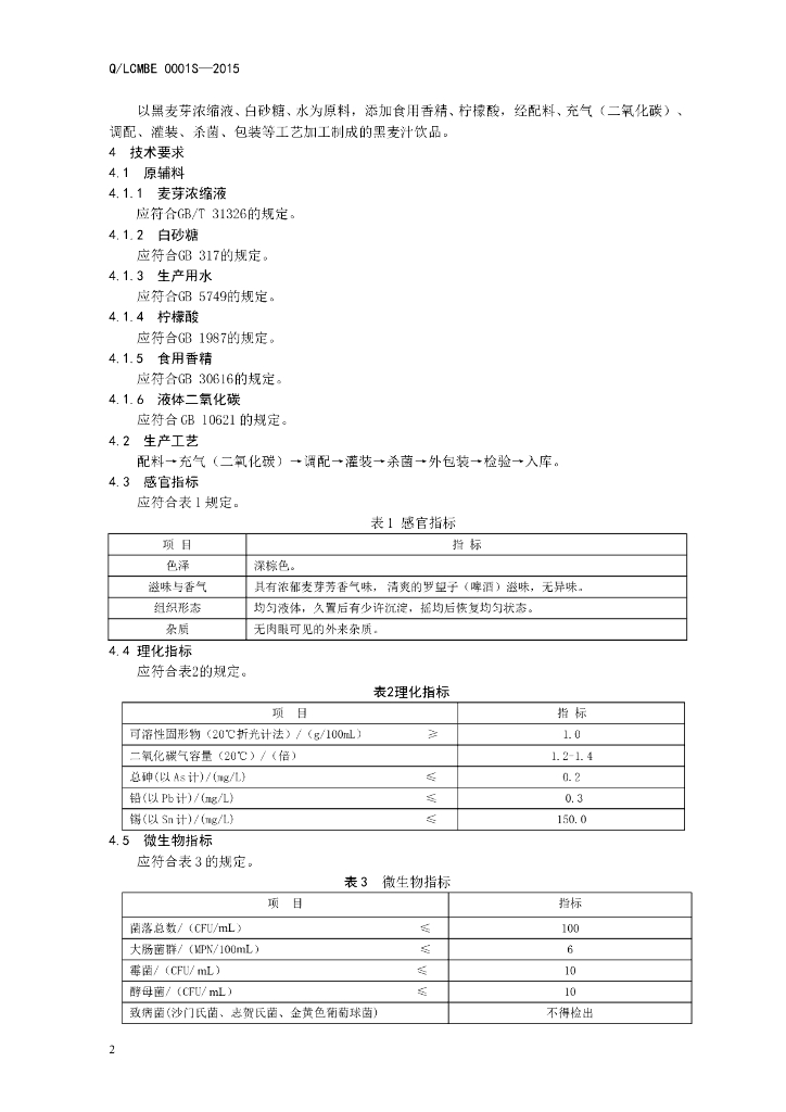 Q/LCMBE 0001S-2015 麦贝儿(北京)生物科技股份有限公司济南分公司 黑麦汁饮品