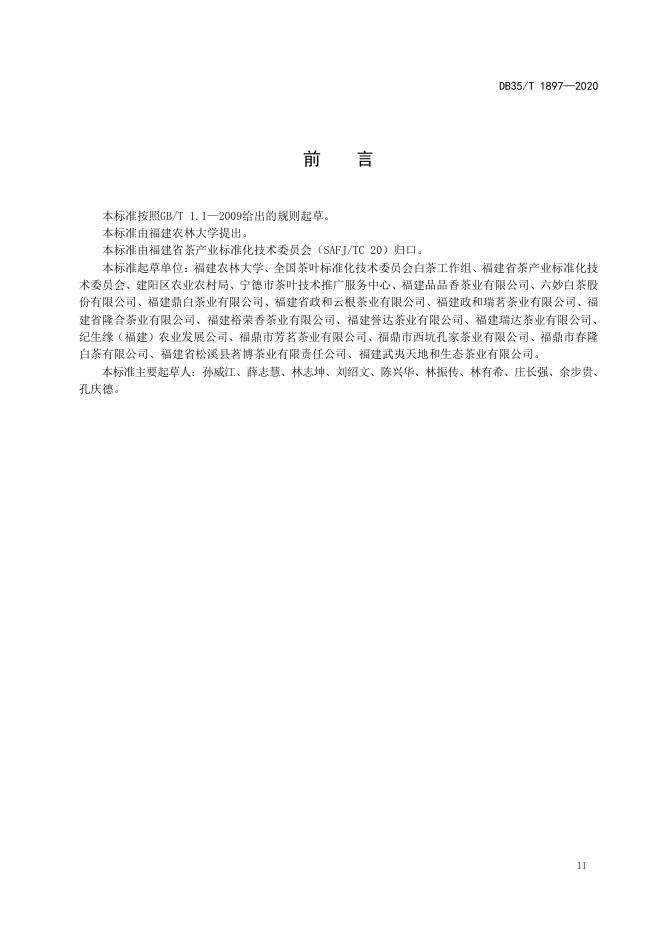 福建农林大学、全国茶叶标准化技术委员会白茶工作组、福建省茶产业标准化技术委员会、建阳区农业农村局、宁德市茶叶技术推广服务中心、福建品品香茶业有限公司、六妙白茶股份有限公司、福建鼎白茶业有限公司、福建省政和云根茶业有限公司、福建政和瑞茗茶业有限公司、福建省隆合茶业有限公司、福建裕荣香茶业有限公司、福建誉达茶业有限公司、福建瑞达茶业有限公司、纪生缘(福建)农业发展公司、福鼎市芳茗茶业有限公司、福鼎市西坑孔家茶业有限公司、福鼎市春隆白茶有限公司、福建省松溪县茗博茶业有限责任公司、福建武夷天地和生态茶业有限公司。