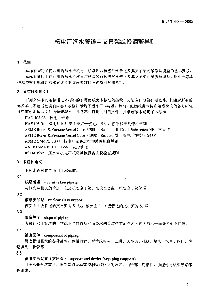 DL/T 982-2005 核电厂汽水管道与支吊架维修调整导则