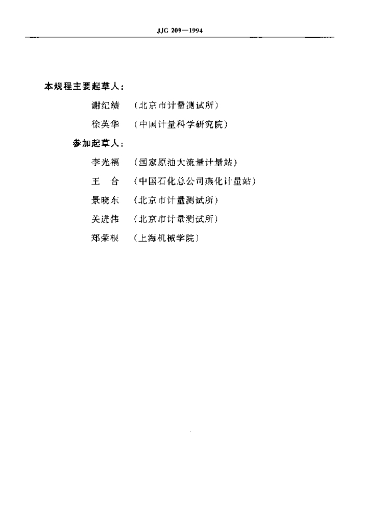 谢纪绩(北京市计量测试所)、徐英华(中国计量科学研究院)、李光福(国家原油大流量汁量站)、王合(中国石化总公司燕化计量站)、景晓东(北京市计量测试所)、关进伟(北京市计量测试所)、郑荣根(上海机械学院)