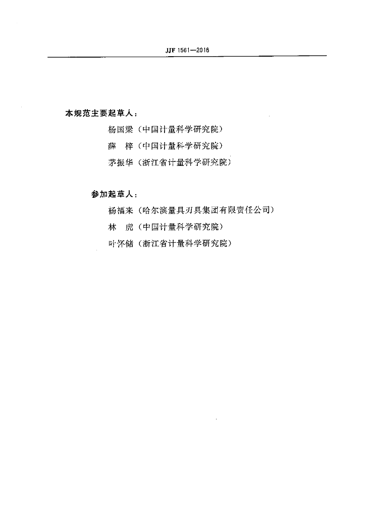 杨国梁(中国计量科学研究院)、薛梓(中国计量科学研究院)、茅振华(浙江省计量科学研究院)、杨福来(哈尔滨量具刃具集团有限责任公司)、林虎(中国计量科学研究院)、叶怀储(浙江省计量科学研究院)