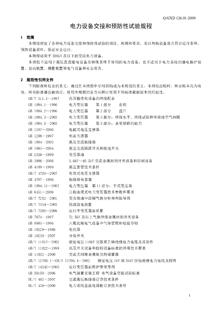 Q/GXD 126.01-2009 广西电网《电力设备交接和预防性试验规程》