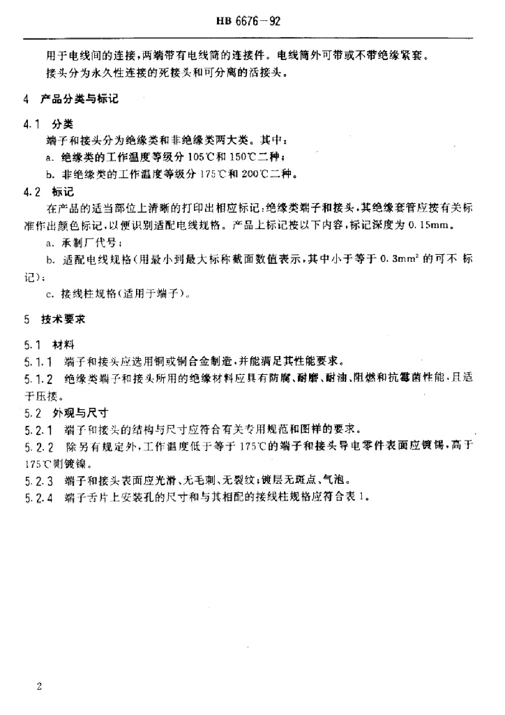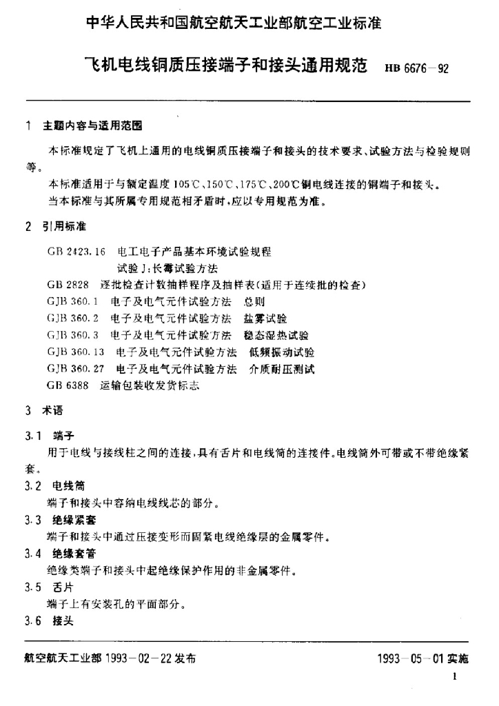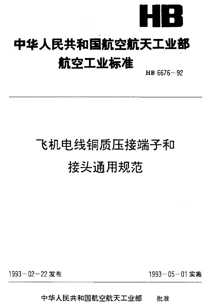 HB 6676-1992 飞机电线铜质压接端子和接头通用规范