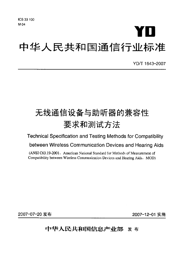 YD/T 1643-2007 无线通信设备与助听器的兼容性要求和测试方法