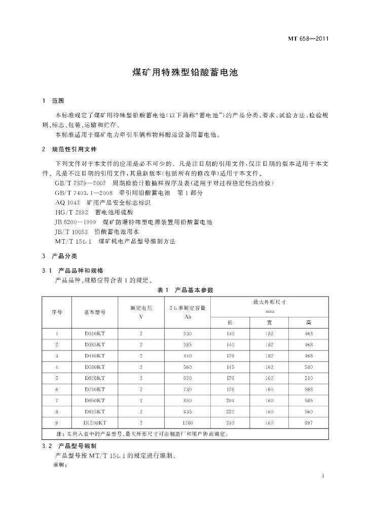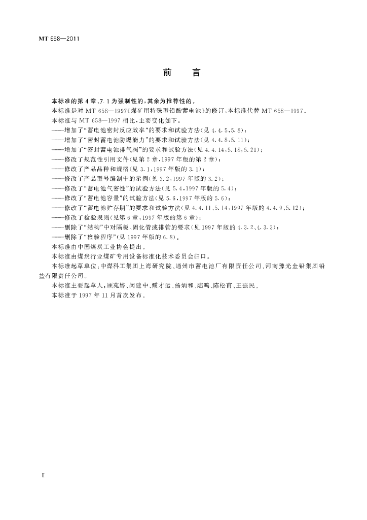 MT 658-2011 煤矿用特殊型铅酸蓄电池