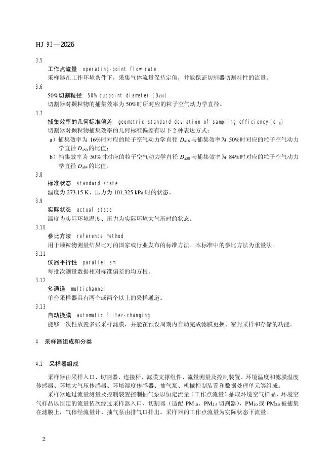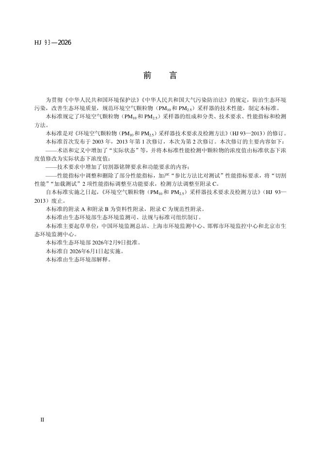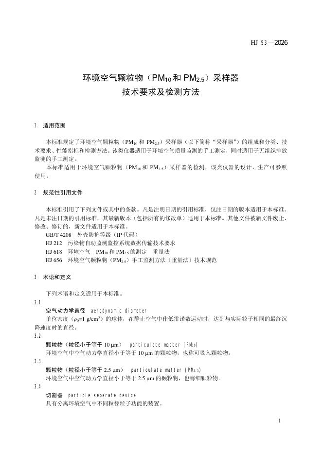 HJ 93-2026 环境空气颗粒物(PM10和PM2.5)采样器技术要求及检测方法