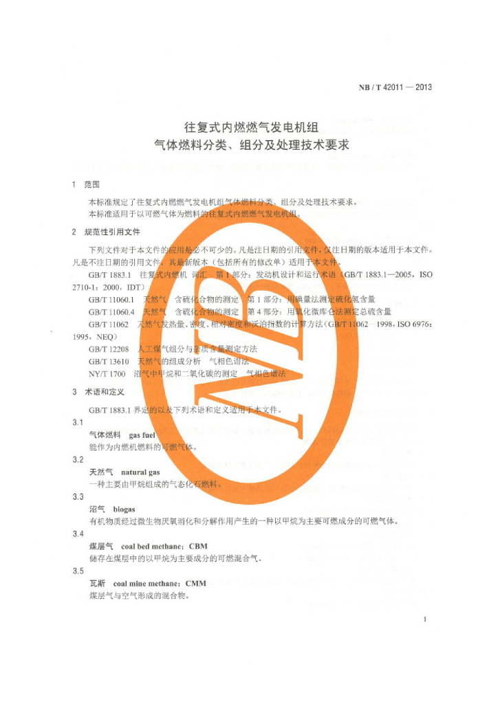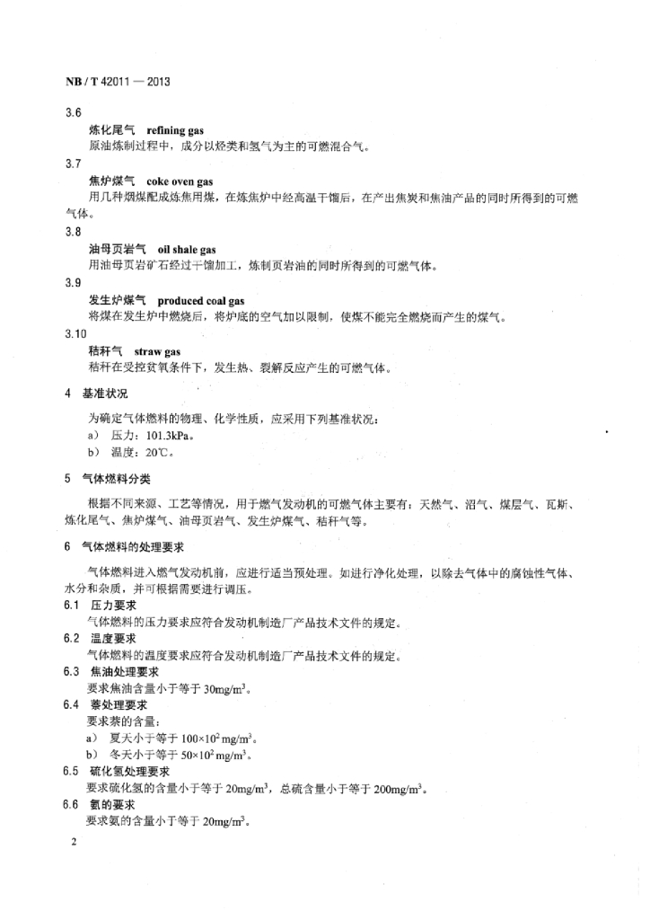 NB/T 42011-2013 往复式内燃燃气发电机组气体燃料分类、组分及处理技术要求