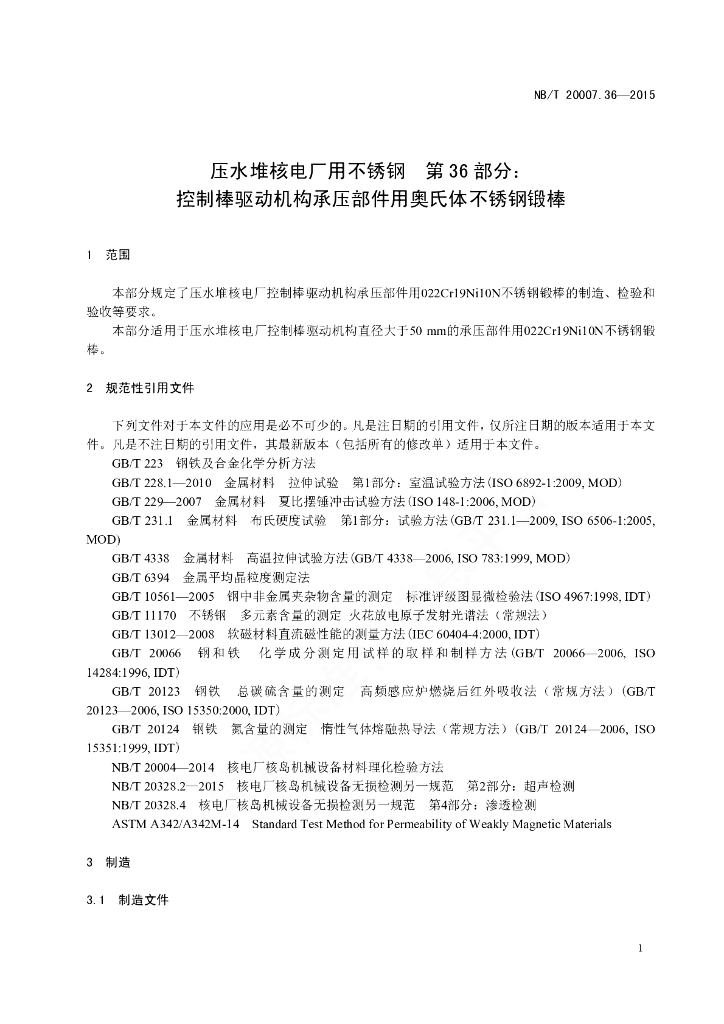 NB/T 20007.36-2015 压水堆核电厂用不锈钢 第36部分:控制棒驱动机构承压部件用奥氏体不锈钢锻棒