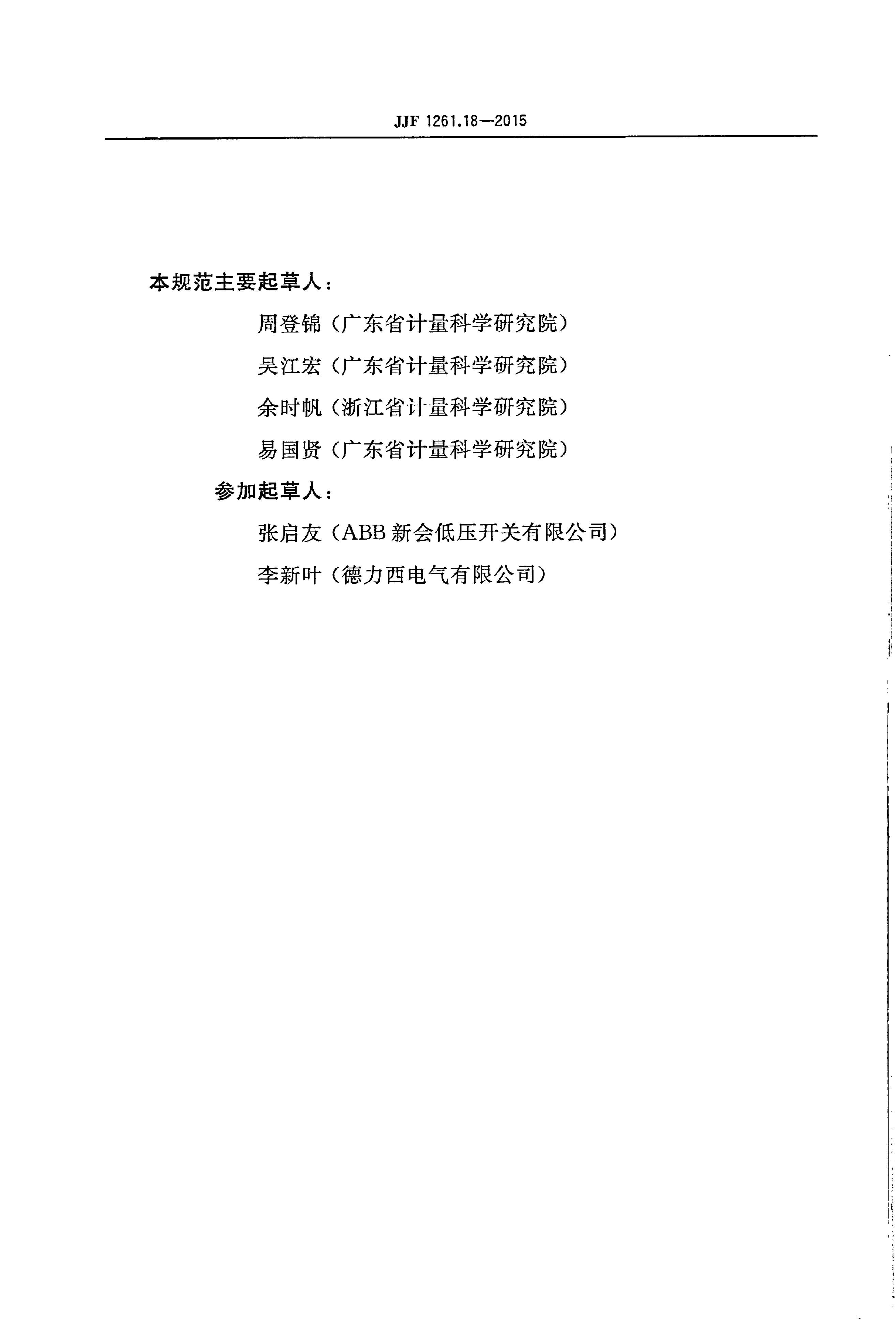 周登锦(广东省计量科学研究院)、吴江宏(广东省计量科学研究院)、余时帆(浙江省计量科学研究院)、易国贤(广东省计量科学研究院)、张启友(ABB新会低压开关有限公司)、李新叶(德力西电气有限公司)