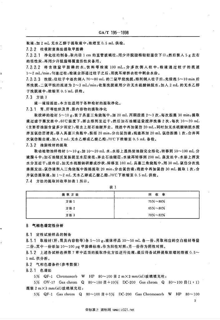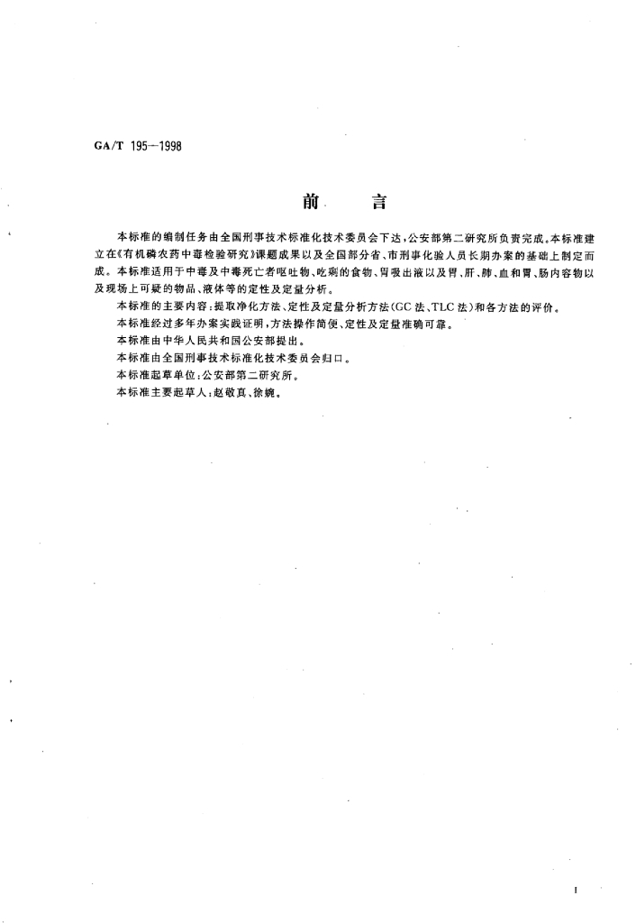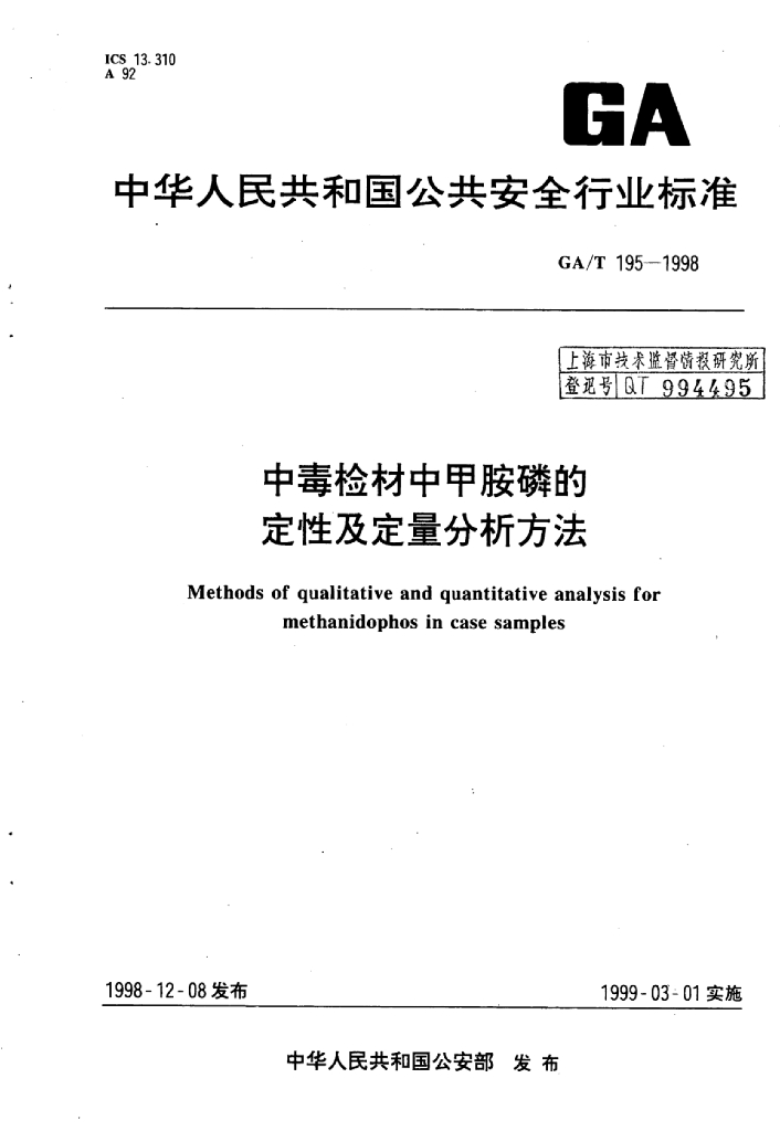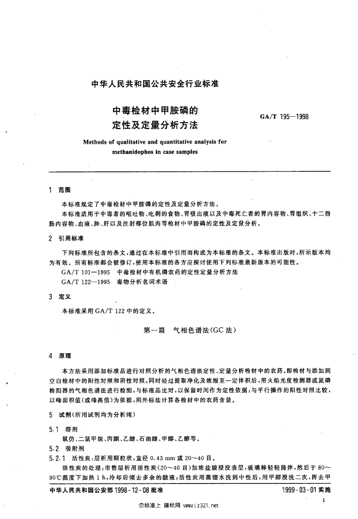 GA/T 195-1998 中毒检材中甲胺磷的定性及定量分析方法