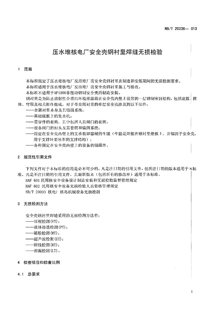 NB/T 20236-2013 压水堆核电厂安全壳钢衬里焊接无损检验