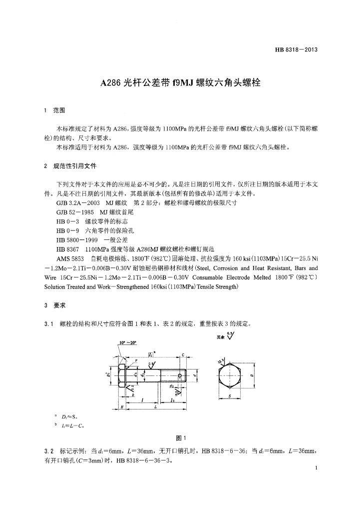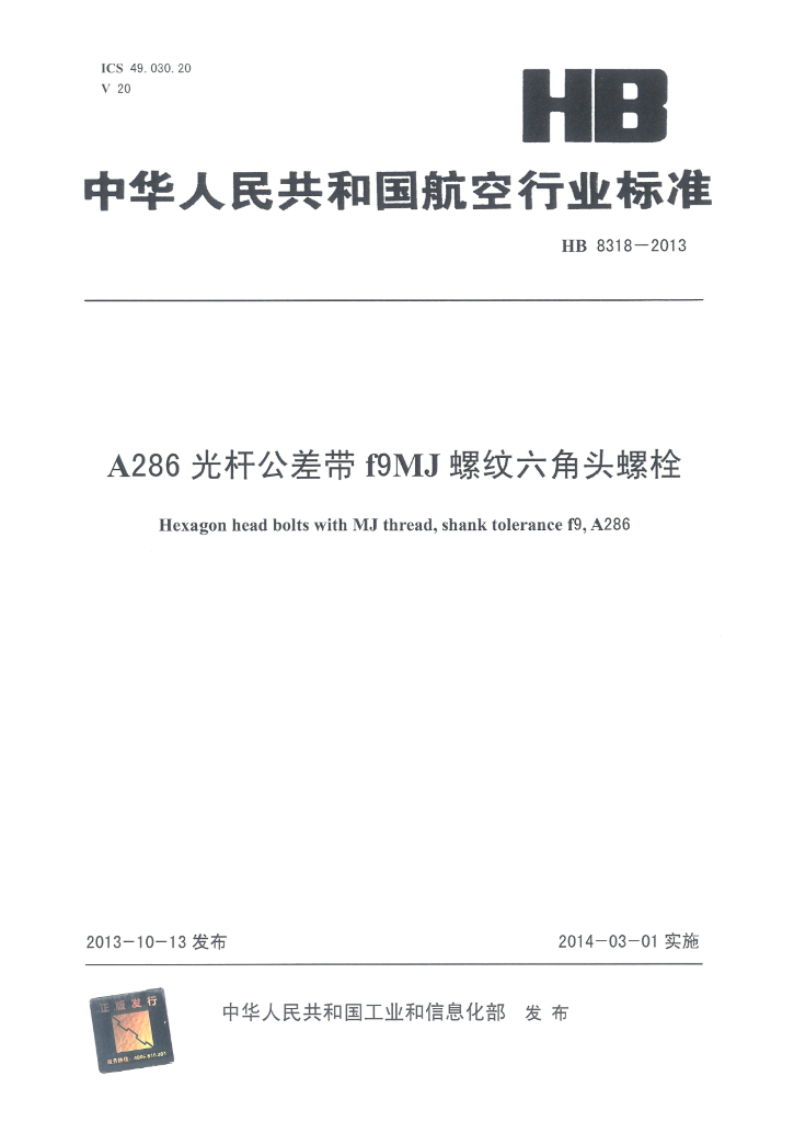 HB 8318-2013 A286光杆公差带f9MJ螺纹六角头螺栓