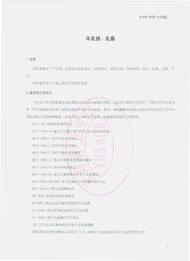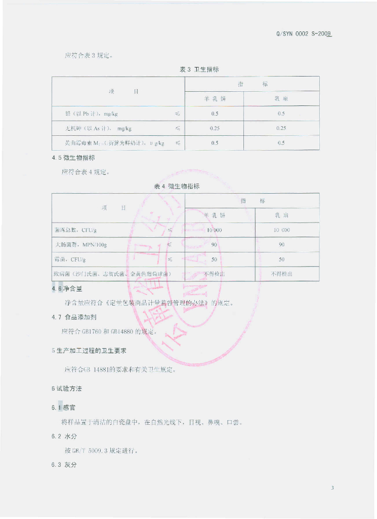 Q/SYN 0002S-2009 羊乳饼、乳扇
