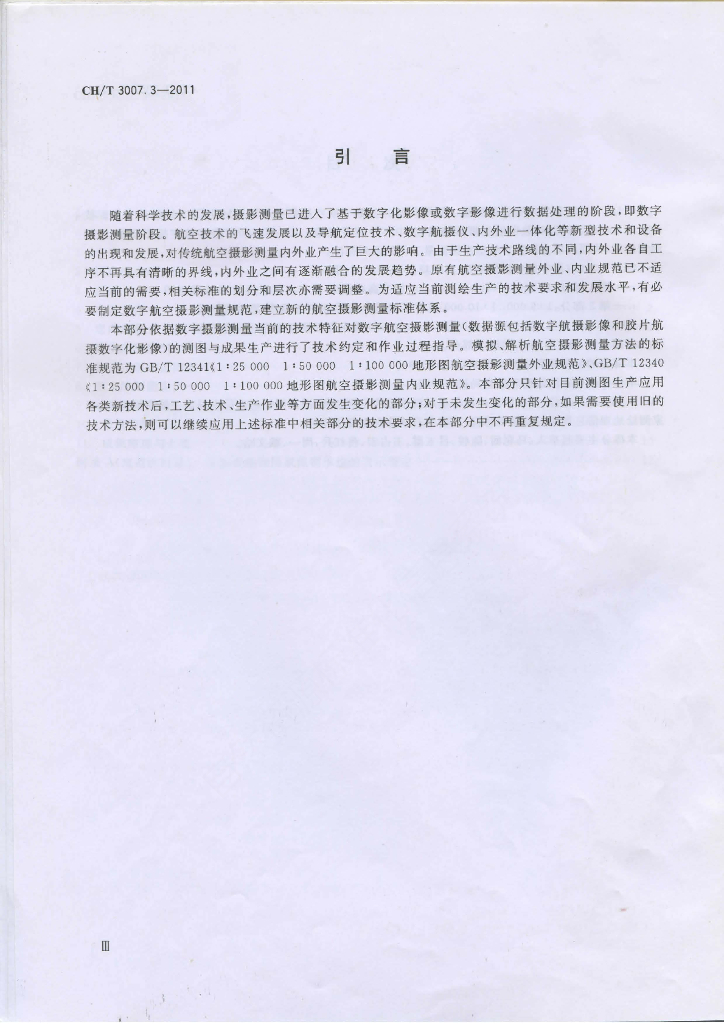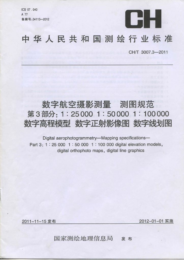 CH/T 3007.3-2011 数字航空摄影测量 测图规范 第3部分:1:25 000 1:50 000 1:100 000 数字高程模型 数字正射影像图 数字线划图