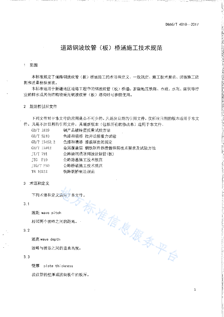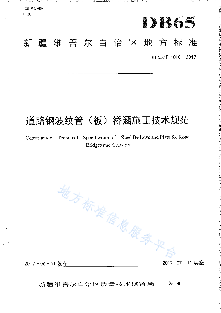 DB65/T 4010-2017 道路钢波纹管(板)桥涵施工技术规范