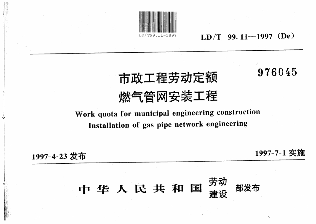 LD/T 99.11-1997 市政工程劳动定额燃气管网安装工程
