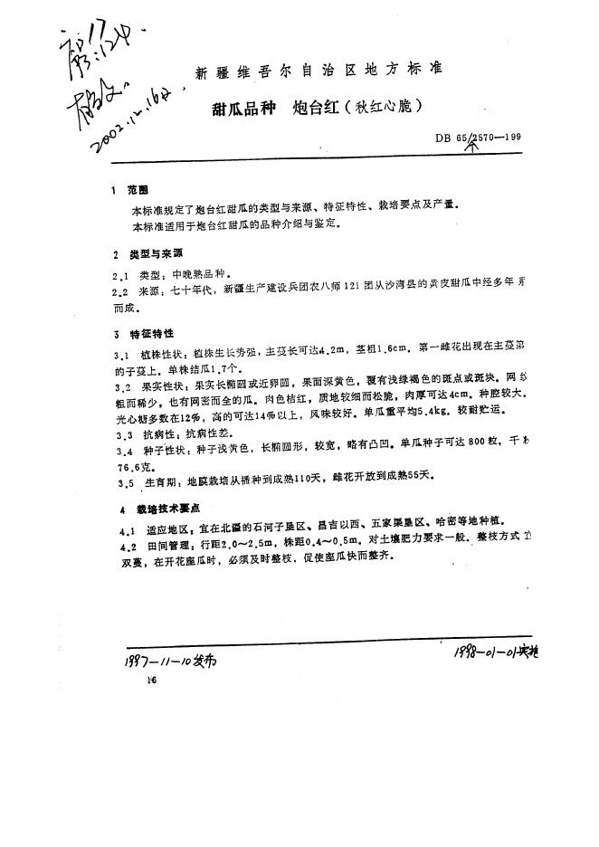 DB65/T 2570-1997 甜瓜品种 炮台红(秋红心脆)