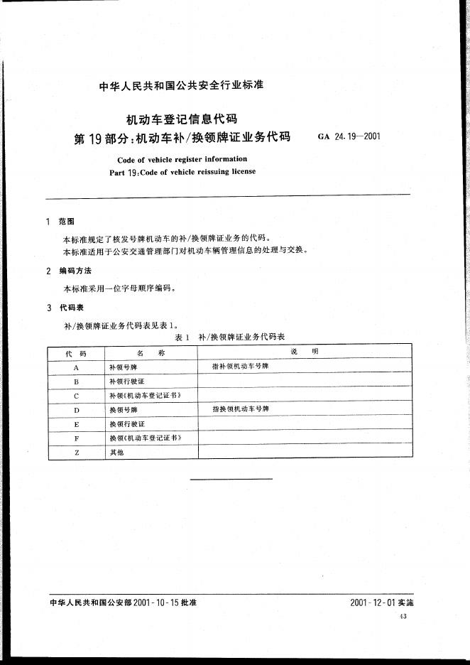 GA 24.19-2001 机动车登记信息代码 第19部分:机动车补/换领牌证业务代码
