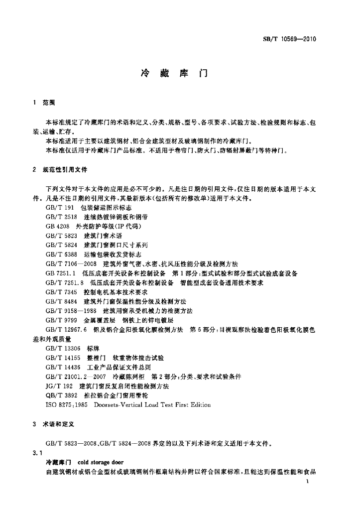 SB/T 10569-2010 冷藏库门标准
