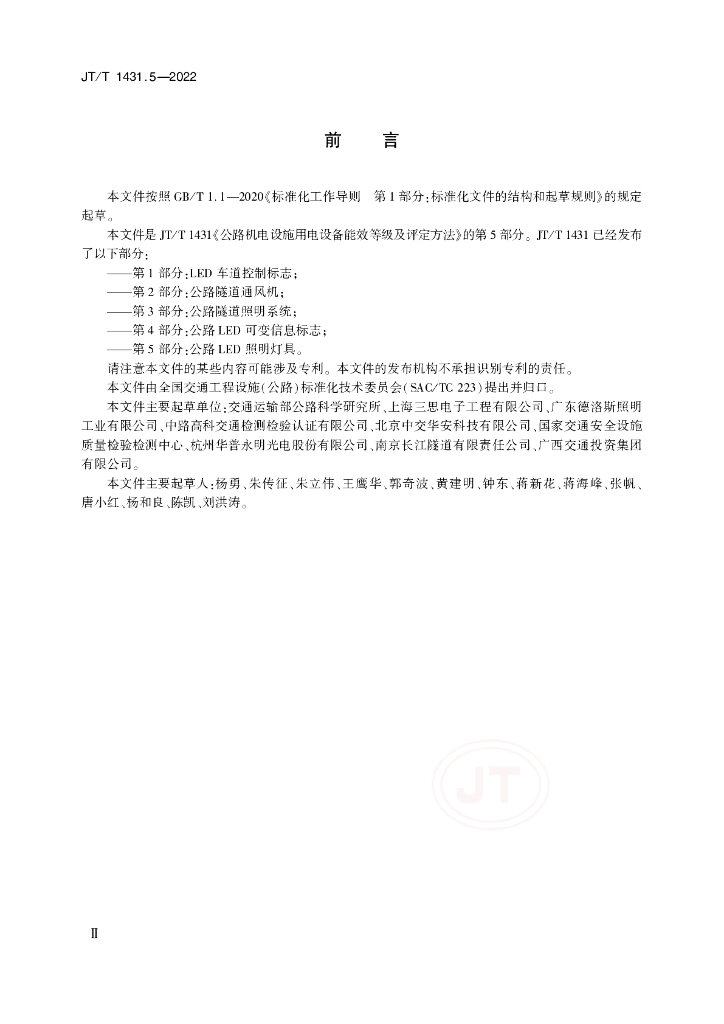交通运输部公路科学研究所、上海三思电子工程有限公司、广东德洛斯照明工业有限公司、中路高科交通检测检验认证有限公司、北京中交华安科技有限公司、国家交通安全设施质量检验检测中心、杭州华普永明光电股份有限公司、南京长江隧道有限责任公司、广西交通投资集团有限公司