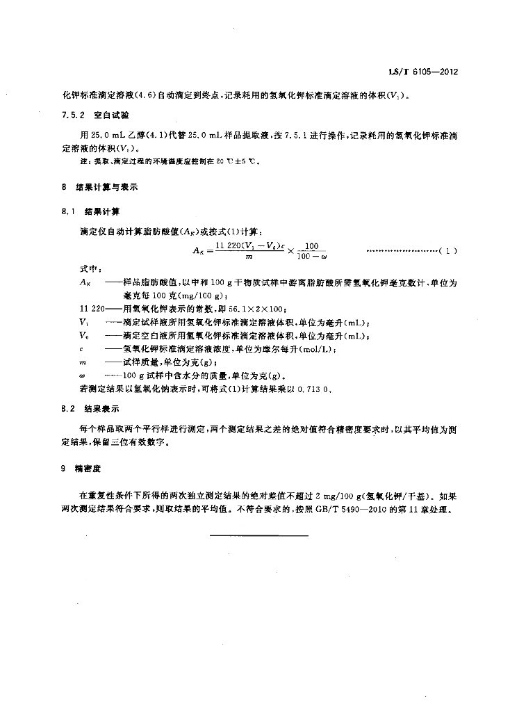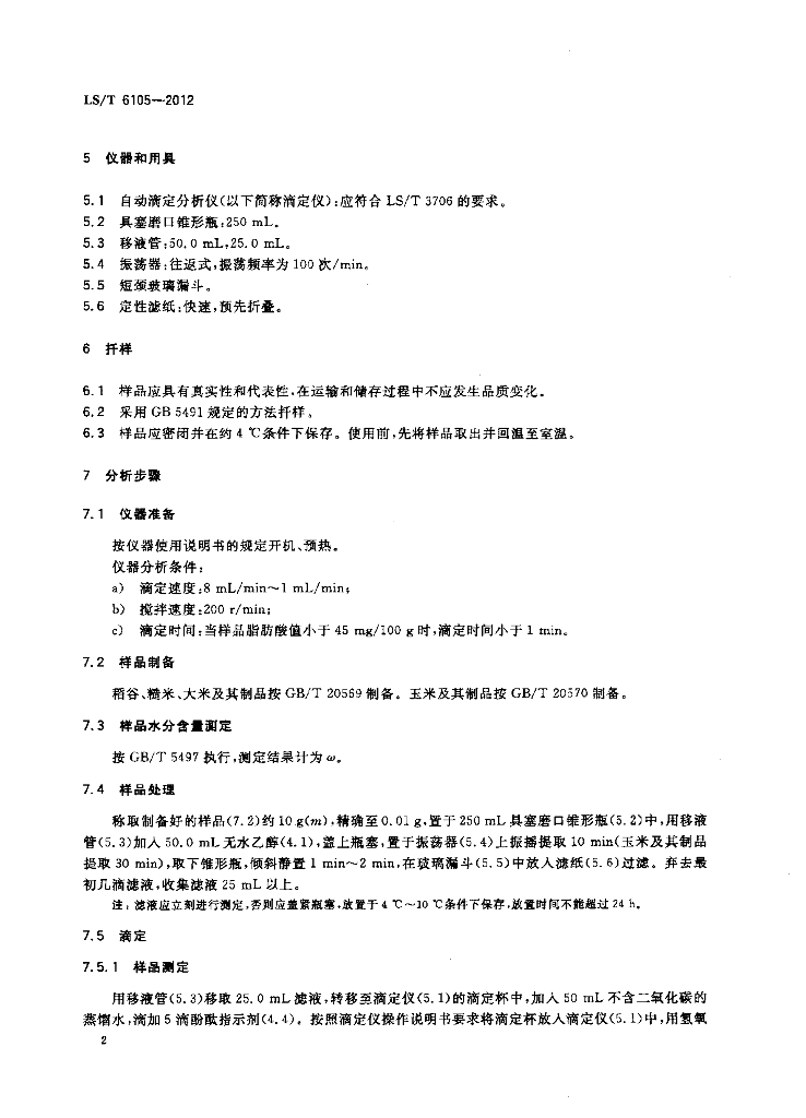 LS/T 6105-2012 粮油检验 谷物及制品脂肪酸值的测定 自动滴定分析仪法