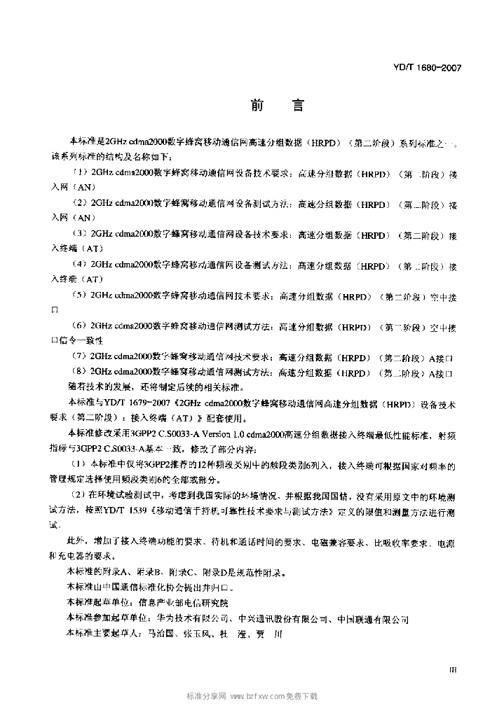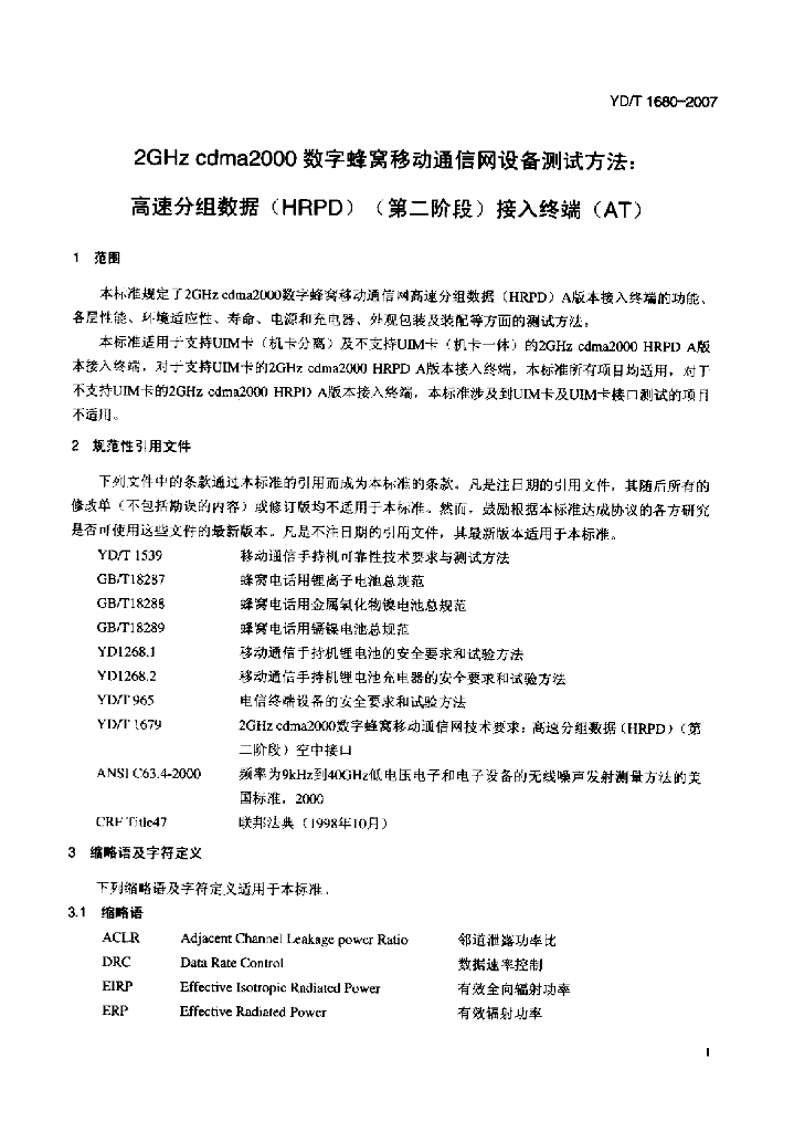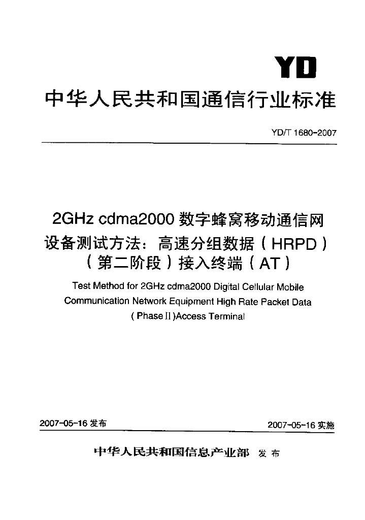 YD/T 1680-2007 2GHz cdma2000 数字蜂窝移动通信网设备测试方法:高速分组数据(HRPD)(第二阶段)接入终端(AT)