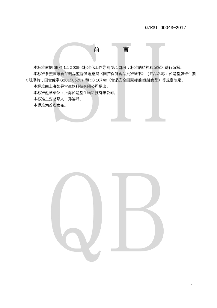 Q/RST 0004S-2017 如是堂牌维生素C咀嚼片