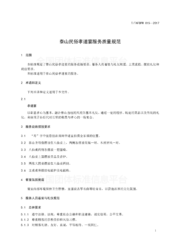 T/TAFDPR 015-2017 泰山民俗孝道宴服务质量规范