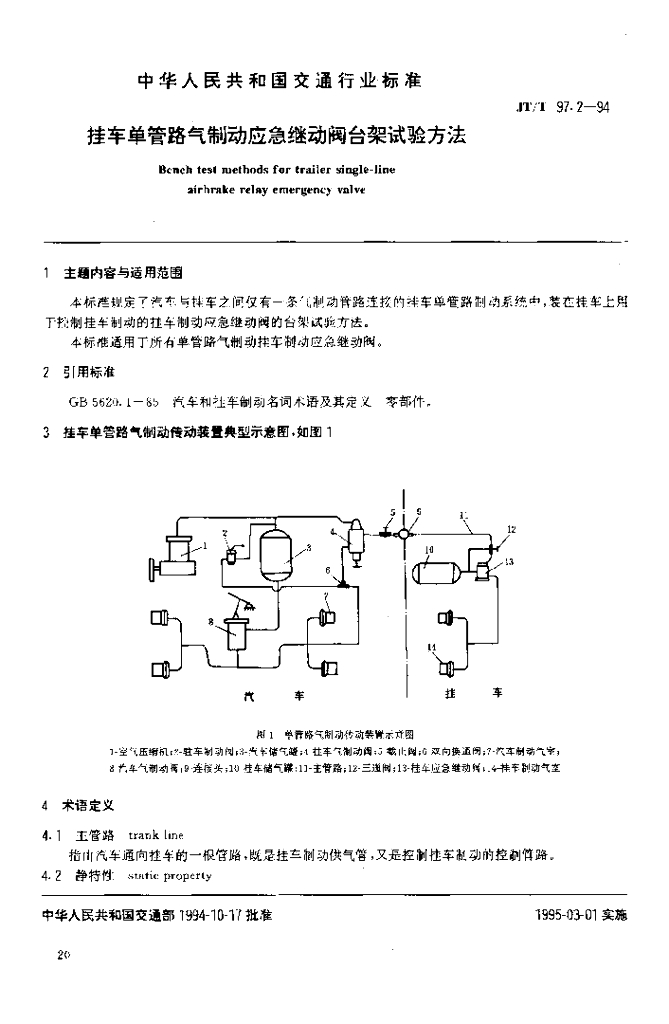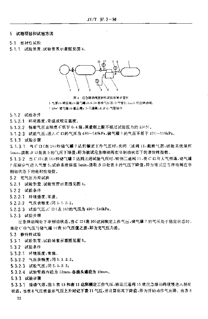 JT/T 97.2-1994 挂车单管路气制动应急继动阀台架试验方法