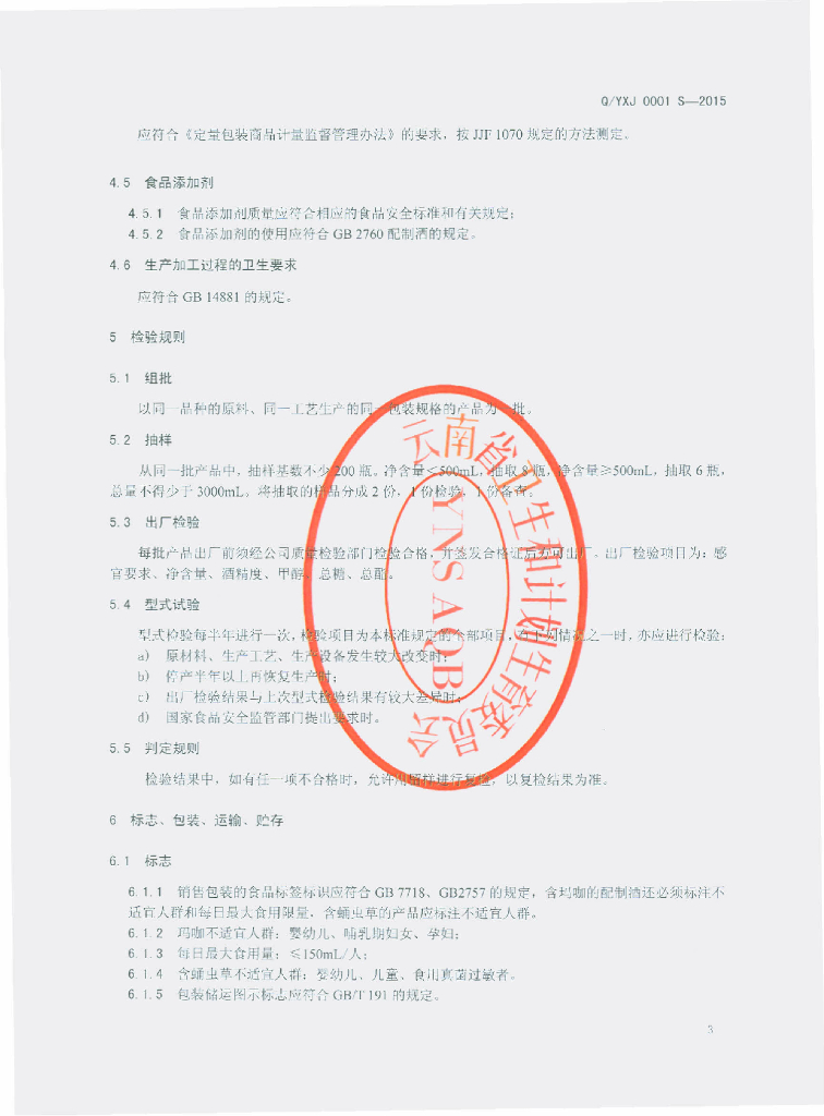 Q/YXJ 0001S-2015 云南轩健食品产业有限公司 配制酒