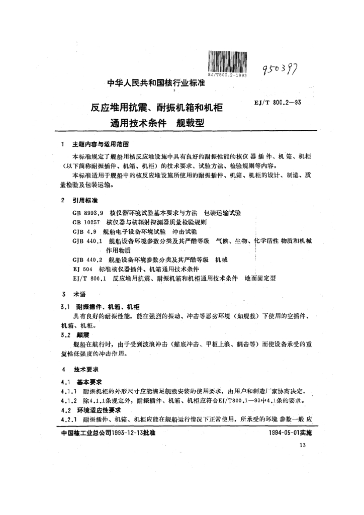 EJ/T 800.2-1993 反应堆用抗震、耐震机箱和机柜通用技术条件 舰载型