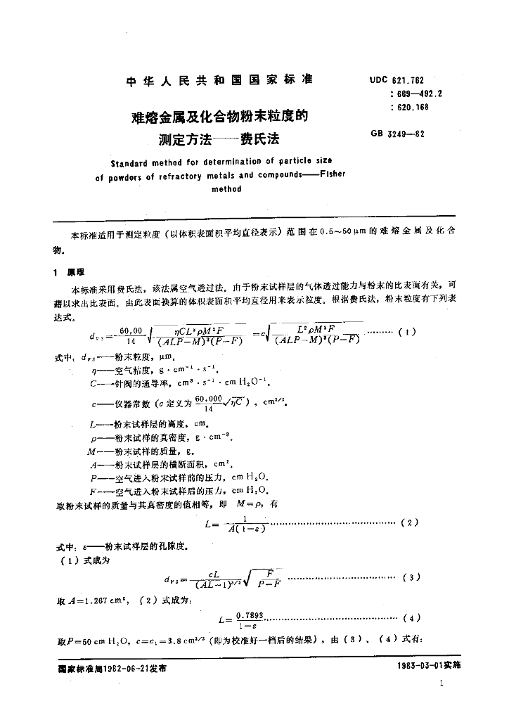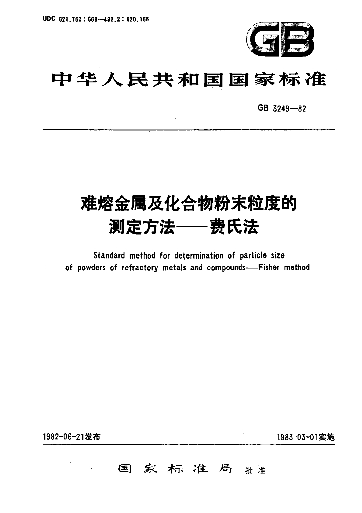 GB/T 3249-1982 难熔金属及化合物粉末粒度的测定方法 费氏法