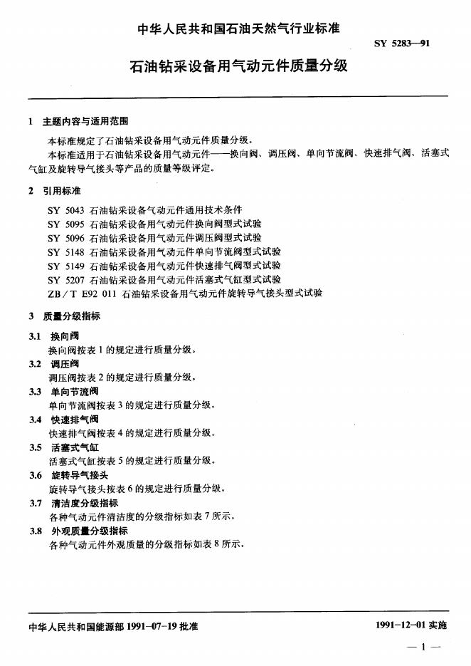 SY 5283-1991 石油钻采设备用气动元件质量分级