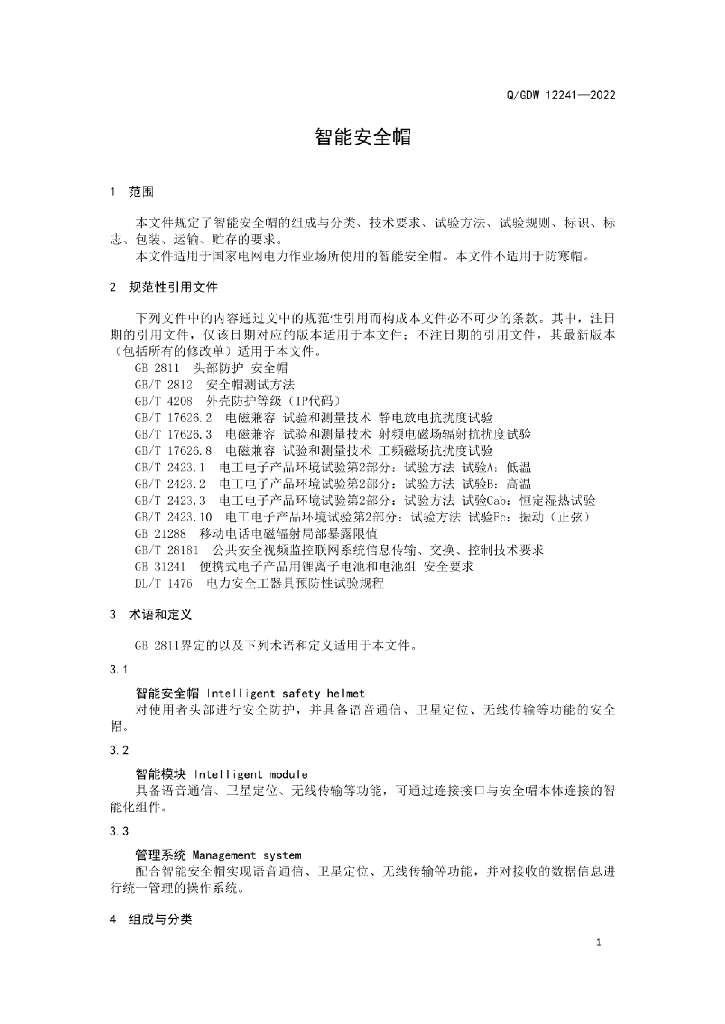 Q/GDW 12241-2022 智能安全帽