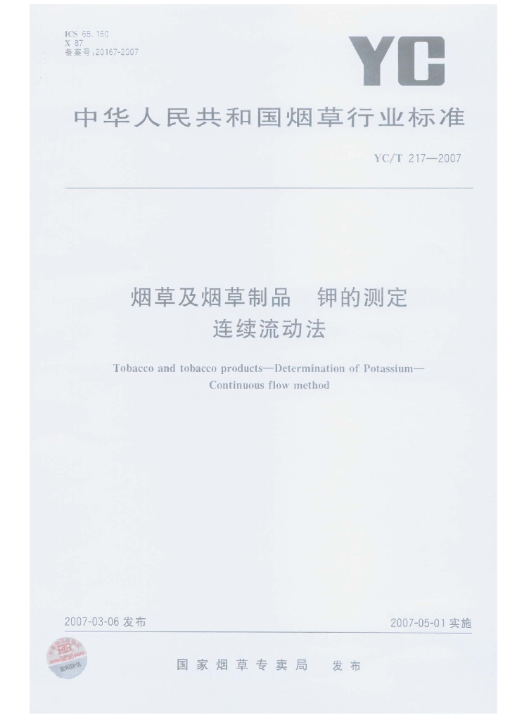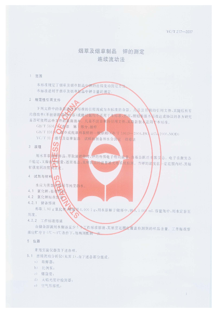 YC/T 217-2007 烟草及烟草制品 钾的测定 连续流动法