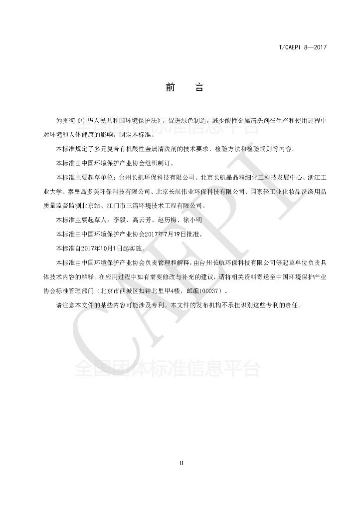 台州长航环保科技有限公司、北京长航晶晶精细化工科技发展中心、浙江工业大学、秦皇岛多美环保科技有限公司、北京长航伟业环保科技有限公司、国家轻工业化妆品洗涤用品质量监督监测北京站、江门市三清环境技术工程有限公司
