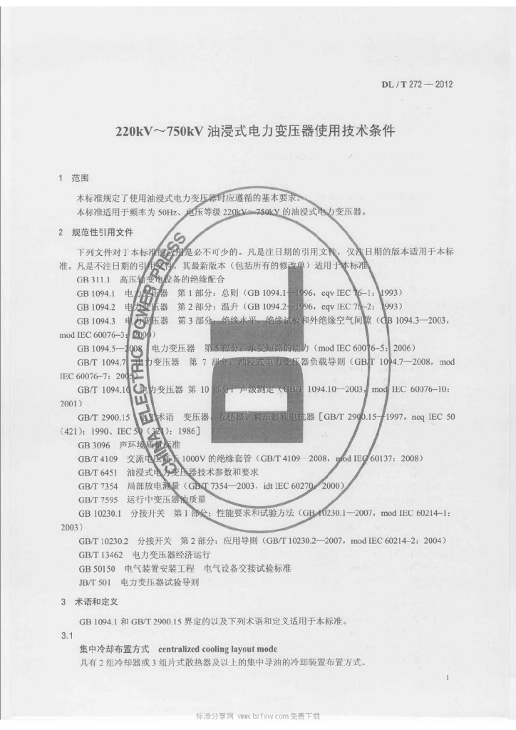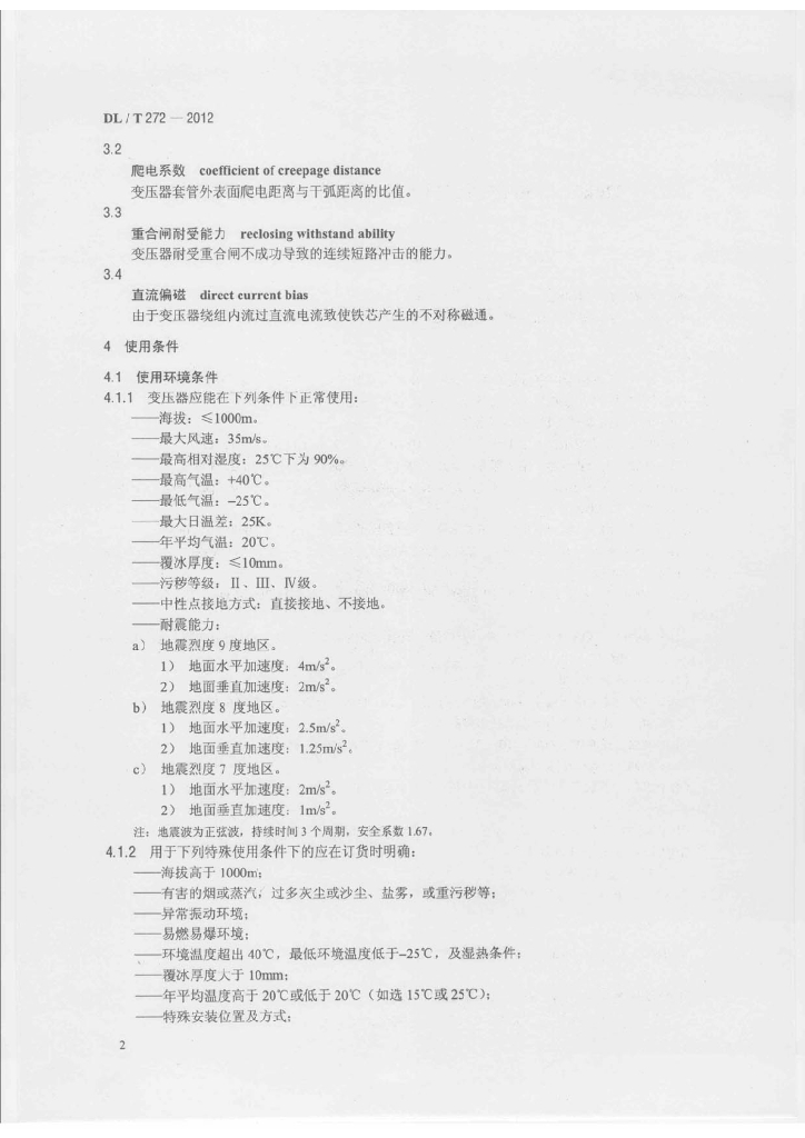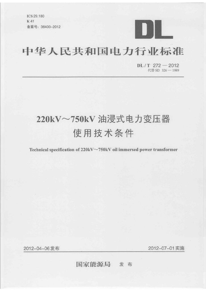 DL/T 272-2012 220kV~750kV油浸式电力变压器使用技术条件