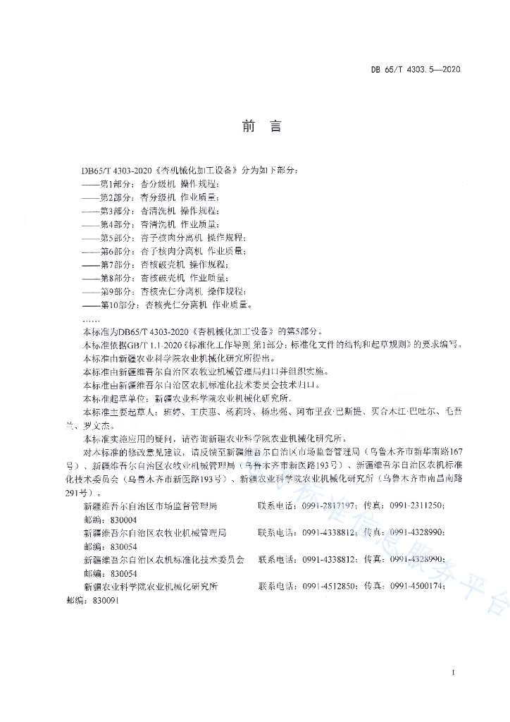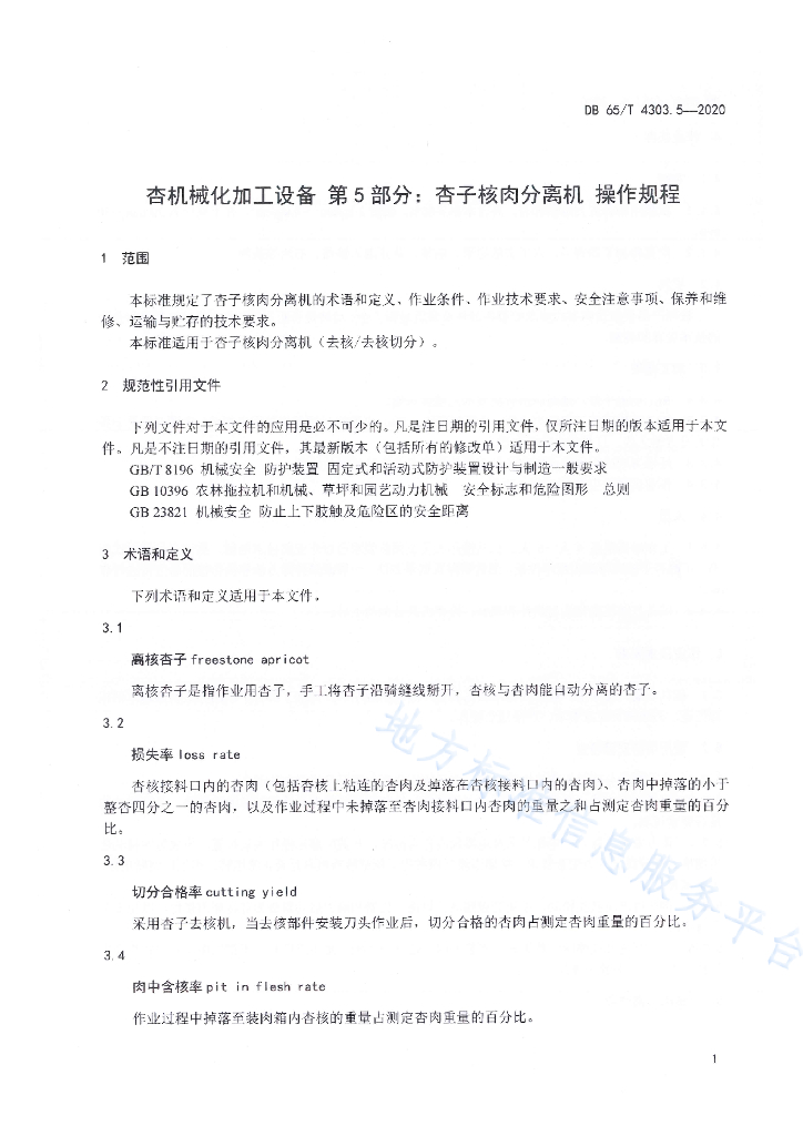 DB65/T 4303.5-2020 杏机械化加工设备 第5部分:杏子核肉分离机 操作规程