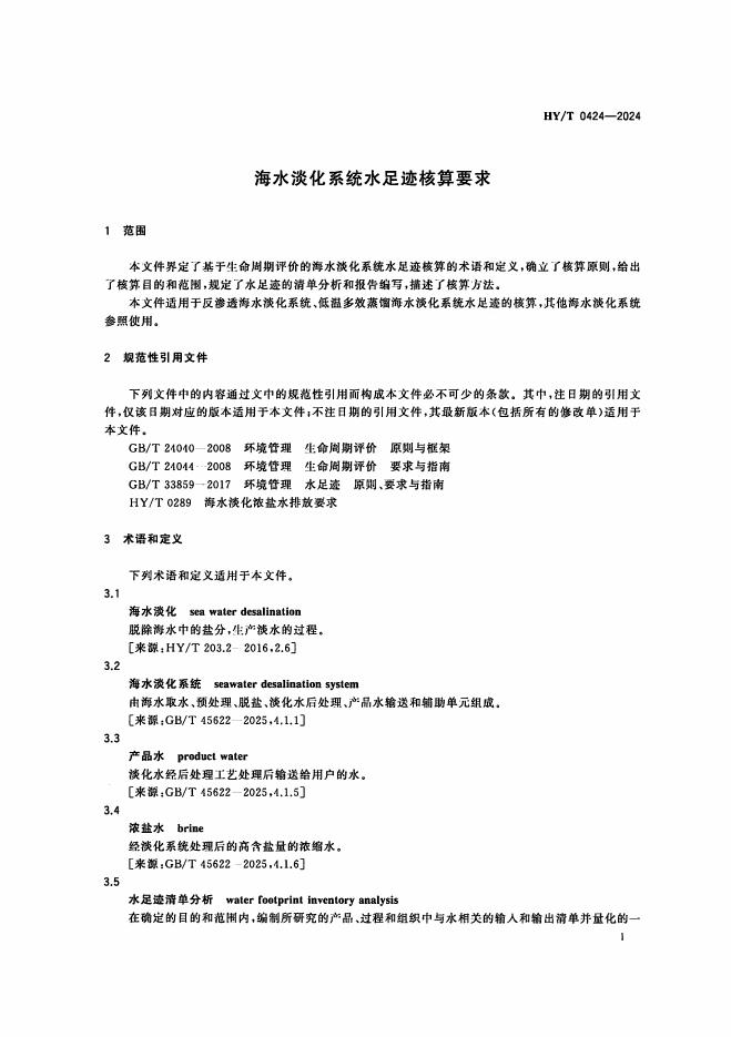 HY/T 0424-2024 海水淡化系统水足迹核算要求