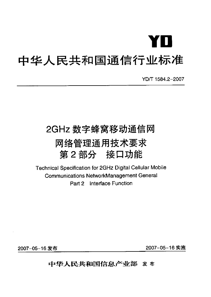 YD/T 1584.2-2007 2GHz 数字蜂窝移动通信网网络管理通用技术要求 第2部分:接口功能