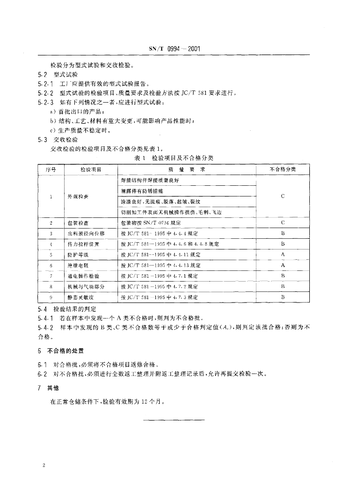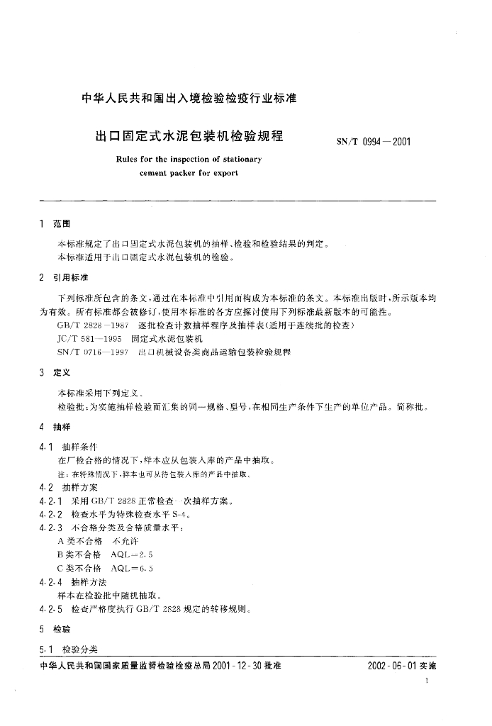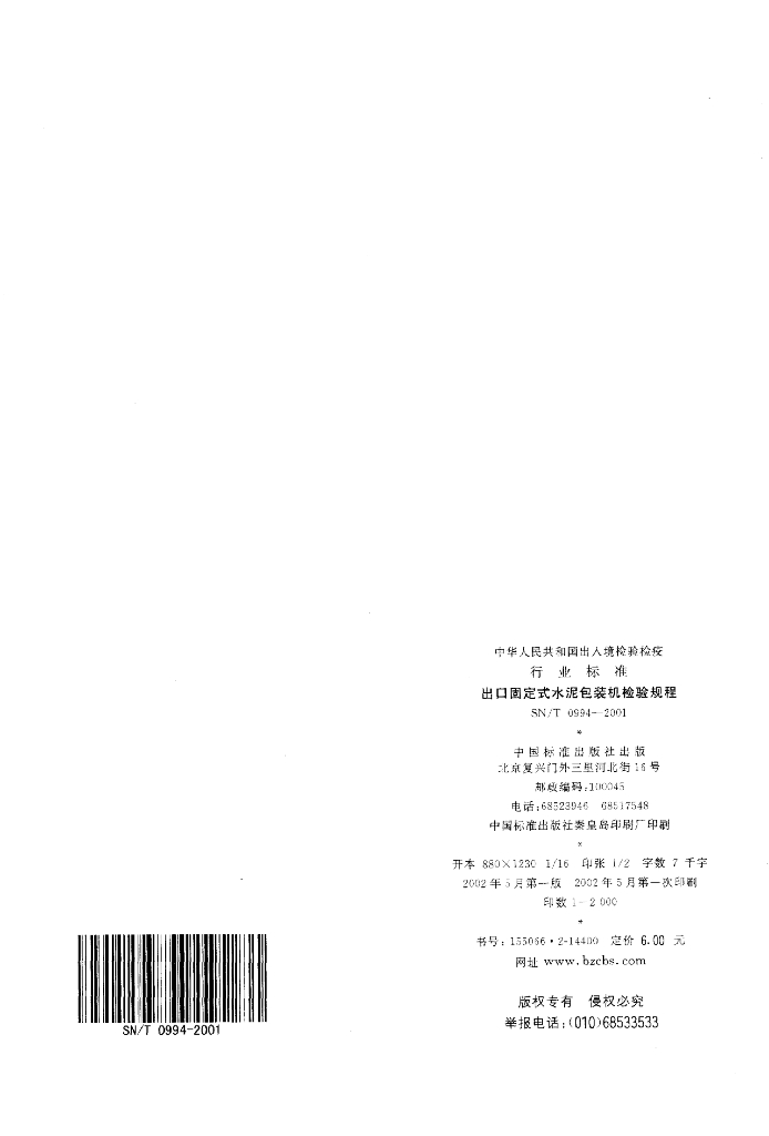SN/T 0994-2001 出口固定式水泥包装机检验规程