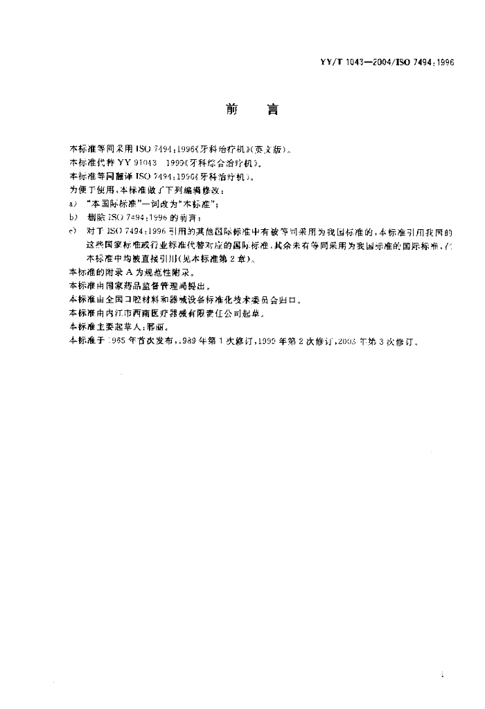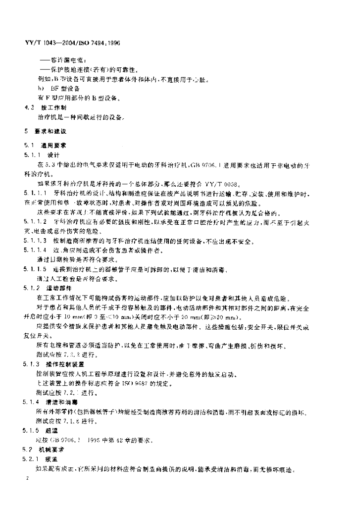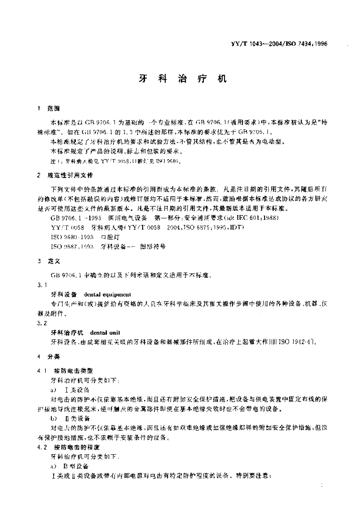 YY/T 1043-2004/ISO 7494: 1996 牙科治疗机