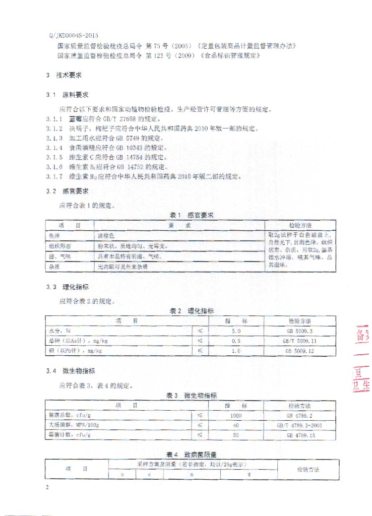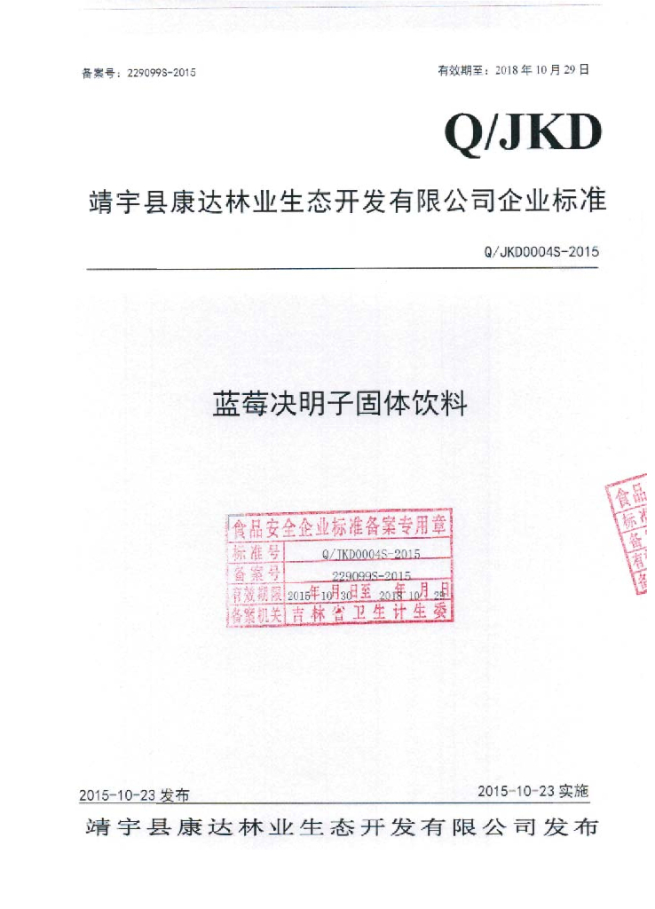 Q/JKD 0004S-2015 靖宇县康达林业生态开发有限公司 蓝莓决明子固体饮料