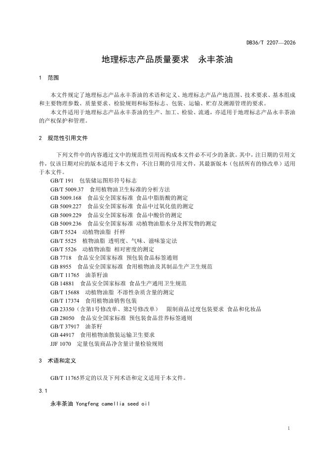 DB36/T 2207-2026 地理标志产品质量要求 永丰茶油