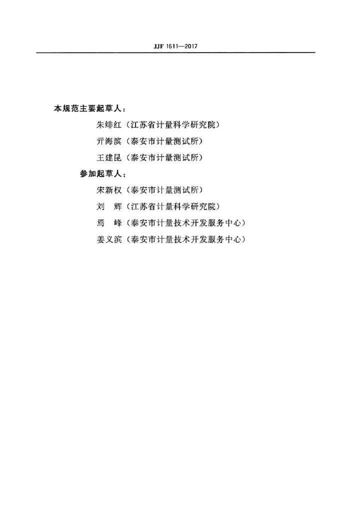 朱绯红(江苏省计量科学研究院)、元海滨(泰安市计量测试所)、王建昆(泰安市计量测试所)、宋新权(泰安市计量测试所)、刘辉(江苏省计量科学研究院)、焉峰(泰安市计量技术开发服务中心)、姜义滨(泰安市计量技术开发服务中心)