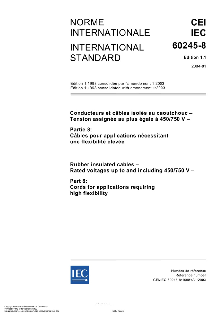 IEC 60245-8:1998+AMD1:2003+AMD2:2011 额定电压450/750V及以下橡皮绝缘电缆 第8部分 特软电线