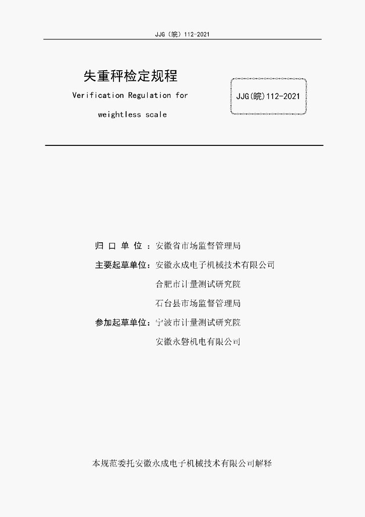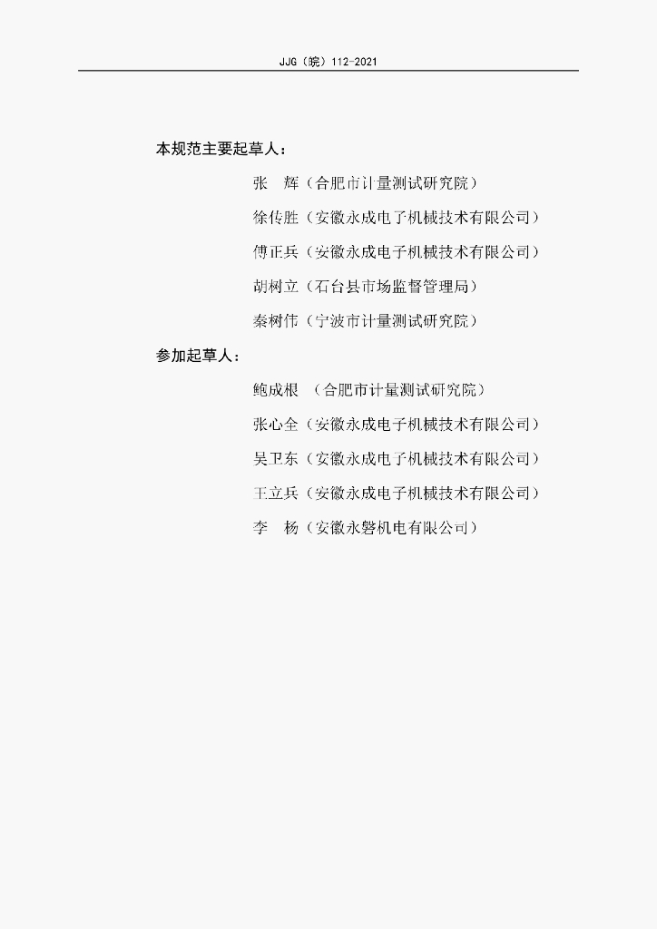 张辉(合肥市计量测试研究院)、徐传胜(安徽永成电子机械技术有限公司)、傅正兵(安徽永成电子机械技术有限公司)、胡树立(石台县市场监督管理局)、秦树伟(宁波市计量测试研究院)、鲍成根(合肥市计量测试研究院)、张心全(安徽永成电子机械技术有限公司)、吴卫东(安徽永成电子机械技术有限公司)、王立兵(安徽永成电子机械技术有限公司)、李杨(安徽永磐机电有限公司)