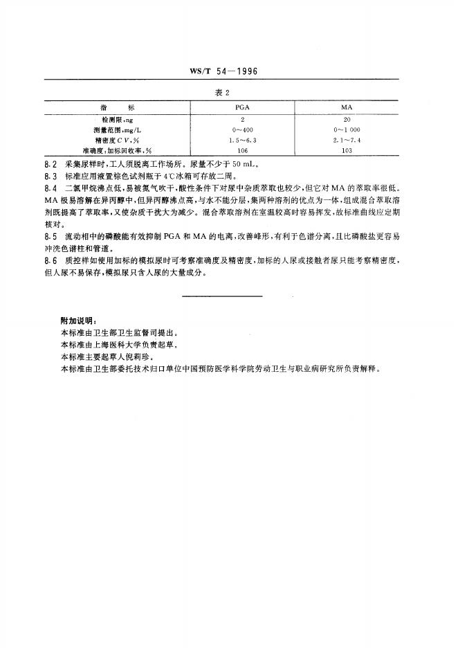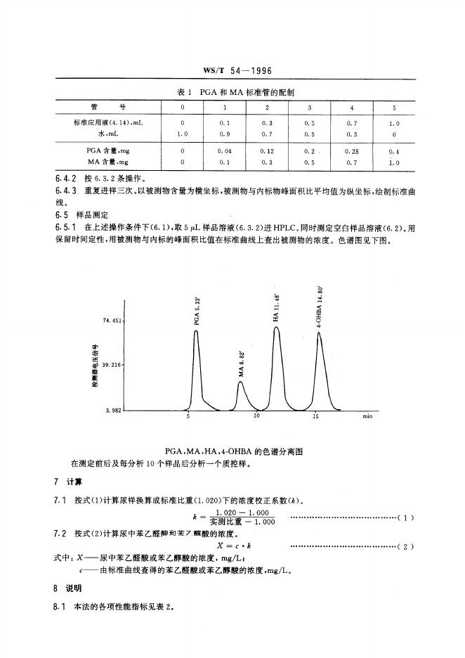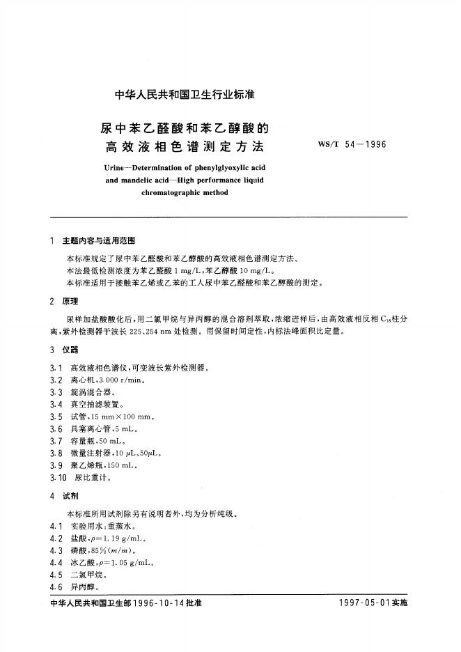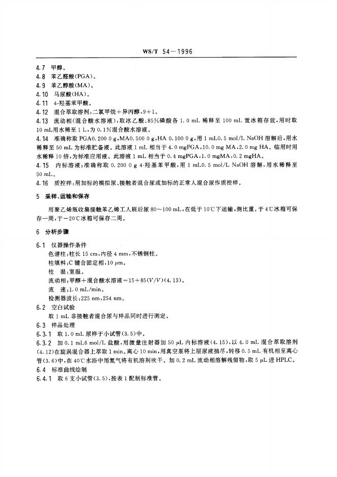 WS/T 54-1996 尿中苯乙醛酸和苯乙醇酸的高效液相色谱测定方法