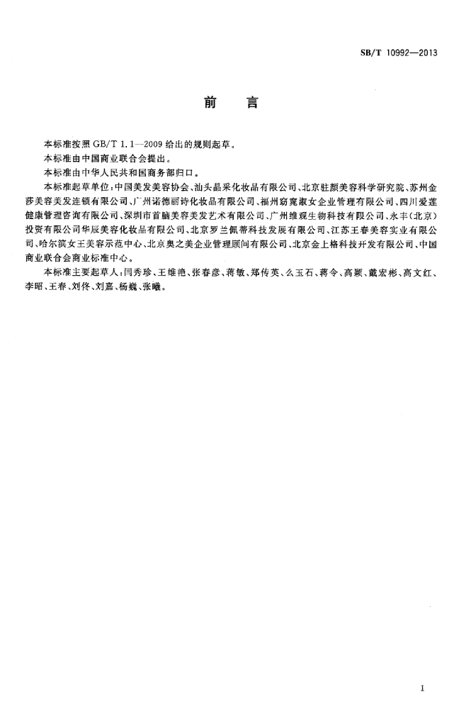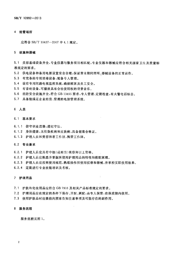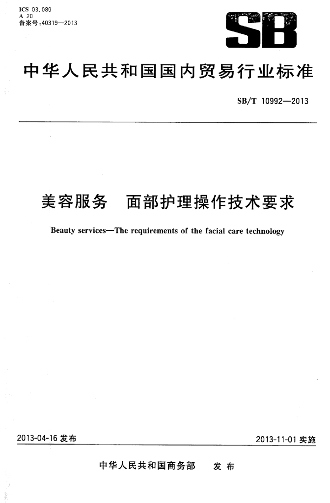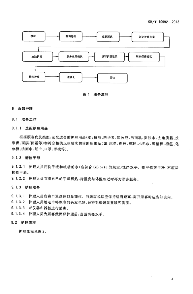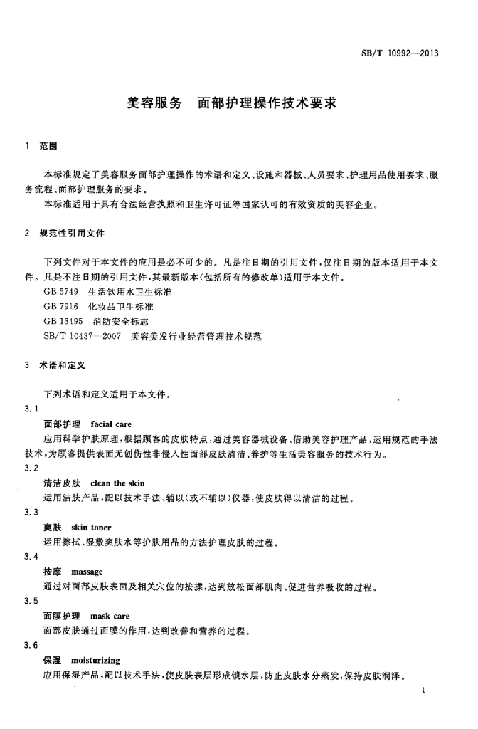 SB/T 10992-2013 美容服务面部护理操作技术要求